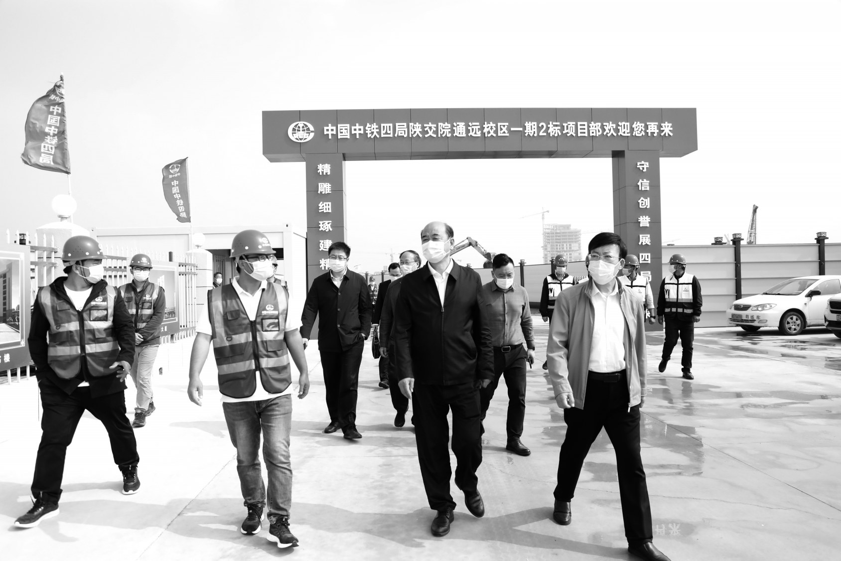 ▲陕西省委教育工委副书记、省教育厅厅长刘建林(前排右二)在陕西交通职业技术学院通远校区考察调研新校区建设工作
