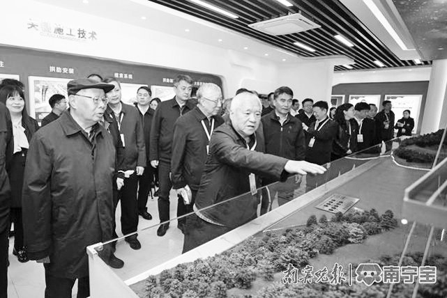 中国工程院院士郑皆连(中)向观摩团成员介绍特大桥复杂地理环境