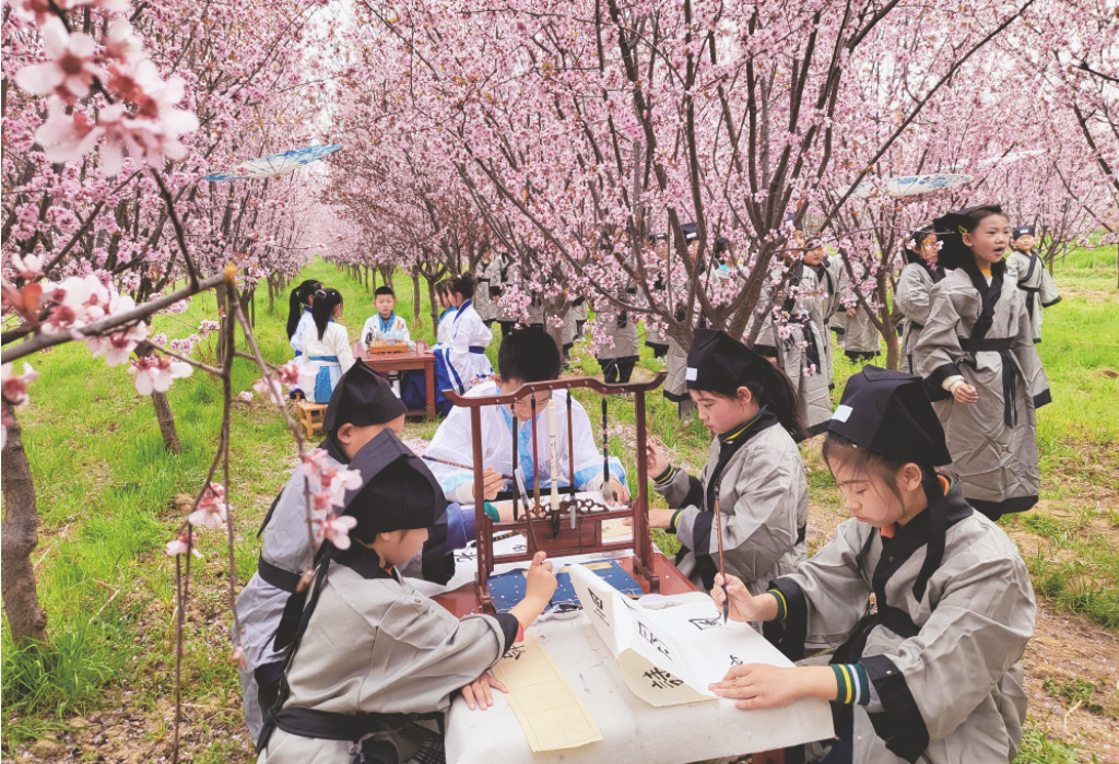 在落英缤纷的“藤头园林”花树林中,一项名为“赏味春光拾趣美好”的寻春活动正在如火如荼地进行中,经典诵读、品茗书画、放飞纸鸢、禅意插花等,孩子们用敏锐的双眼去寻找春天,用优美的语句去赞美春景,用真诚的心怀去感受春的生命。在“蛋”传奇主题农场里,孩子们在老师生动有趣的讲解下,充分体验充满现代感的第三代养殖技术,对现代农业科技产生无尽向往……