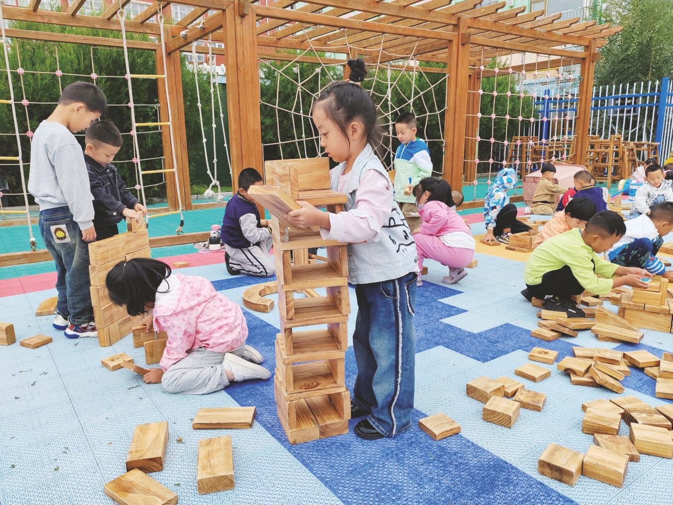 始建于1956年的定边县幼儿园目前是省级示范幼儿园,占地面积6181.3平方米,随着在园幼儿持续增加,生均活动空间愈显局促。为此,该园立足全域视角拓展空间,打造户外、室内的双建构游戏体验场域。“我们在优化户外沙水、生活、艺术创想、骑行、积木、红砖建构区的同时,将各楼层可利用的区域打造成室内搭建区、体能锻炼区、公共阅读区,还将科探室改造为现代化厨房,与户外传统生活互补。”园长胡燕说,在此基础上,幼儿园购置各类积木、万能工匠、爬梯、红砖、平衡木等游戏材料供儿童随时取用,还添置储物架、器材推车、可移动水杯架等材料柜,提升材料收纳功能。