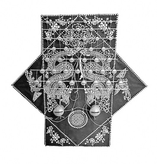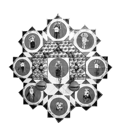 如南通板鹞风筝中常见的七联星风筝,即用六角形自上而下作“二、三、二”排列,还有由“三、四、五、四、三”排列组合而成的十九联星风筝。九联星风筝的骨架结构呈放射状,以一个八角形骨架为中心,外圈围以数个六角形骨架或八角形骨架,组合成一个圆环。放射状的组合让板鹞风筝具备了更强的延展性,增加了更多变化,甚至能实现数十、百余联星。这种变化丰富的结构以其独特的几何形态和空间布局,体现出我国传统吉祥文化中周而复始、和谐圆满的寓意,表达着天人合一、阴阳共生的哲学思想。