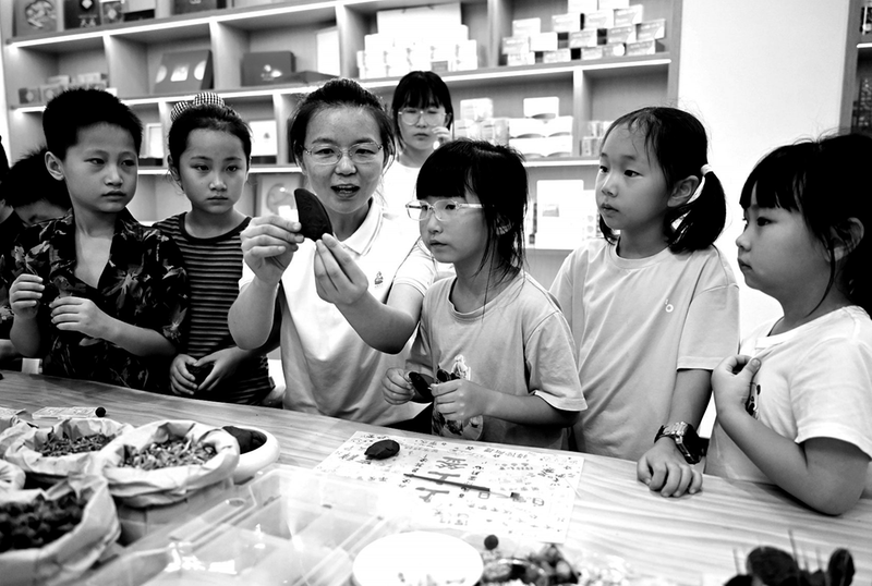 ▶ 暑假期间,安徽省亳州市青少年在家人的陪同下,走进“养生会客厅”,在工作人员指导下,现场学习制作中药文创合香、香包等,体验中医药文化的独特魅力。图为工作人员在教孩子们制作荷香刮痧板。