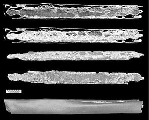 故宫博物院委托检测的西汉漆鞘铁制书刀,作为我国古代用于删改简牍文字的重要书写工具,早在商代便已出现,汉代尤为盛行,成为文人书房中的典型器物。该样品因铁质刀身与漆鞘严重锈蚀粘连,传统无损检测方法——X射线、CT因为铁器观测的高能量需求,影响了对锈蚀部分的观察。此时,中子CT技术在不破坏文物的前提下,可以轻易地穿透铁,揭示书刀内部锈蚀产物和裂纹的三维空间分布,同时展现切削刃复合结构,为研究文物的锈蚀路径提供了新视野。